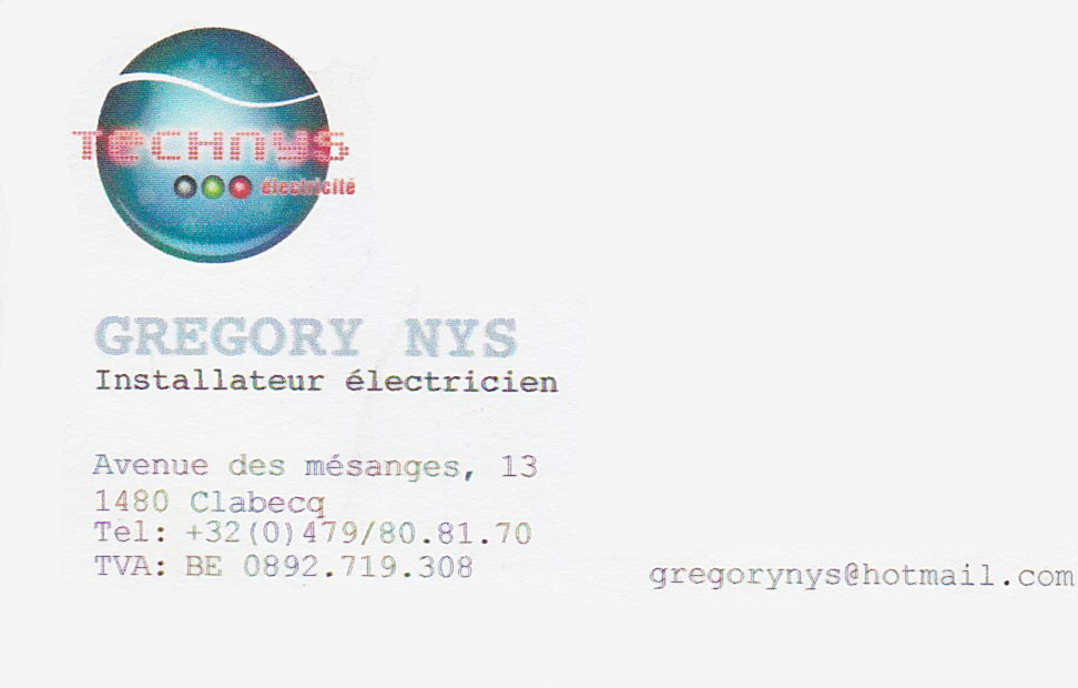 Electricien TRES compétent et pratiquant des prix tout à fait raisonnables. Grégory NYS, avenue des Mésanges, 13 à 1480 Clabecq. Tél : 0479/80.81.70. Mail : gregorynys@hotmail.com -